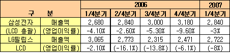 특히, 장비ㆍ부품소재의 국산화율이 각각 50%, 66%에 불과하고, 핵심 장비재료의 해외 의존이 높아 실제 국산화율은 30-40%에 그치고 있다. 따라서 세계 1-2위를 다투고 있으나 일본기업들의 공격적 설비투자와 한국을 따돌리기 위한 일본-타이완의 동맹에 대응하기 위해서는 연합이 시급한 것으로 지적되고 있다. 일본 Sharp는 2006년 8월 세계 최초로 8세대 LCD 라인 가동에 들어갔으며, PDP 세계 1위 Matsushita는 신규라인 건설에 2800억엔을 투자할 계획이다. 또 2006년 일본 Sharp와 타이완 CMO, CPT의 특허제휴를 체결한데 이어 Matsushita는 LCD 모듈을 타이완기업에 아웃소싱하는 방안을 검토하고 있다. 표, 그래프: | LCD 매출 및 영업이익률 현황 | <화학저널 2007/05/14> |