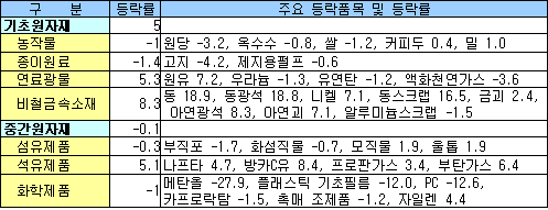 반면, 석유제품은 국제유가 상승으로 5.1% 급등했다. 표, 그래프: | 기초ㆍ중간 원자재 수입물가 등락률(2007.4) | <화학저널 2007/05/14> |