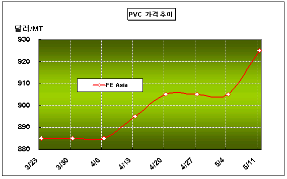 CFR FE Asia 920-930달러로 20달러 상승 … 미국의 남미 수출로 PVC 가격은 5월 둘째주 CFR FE Asia 톤당 925달러로 20달러 올랐다.아시아 PVC(Polyvinyl Chloride) 시장은 미국이 아시아 수출을 중단하고 남미 수출로 전환함에 따라 수급이 타이트해져 2007년 최고기록을 수립했다. 국내 PVC 생산기업도 남미 수출에 나서 FOB Korea 톤당 950달러를 받은 것으로 알려졌다. 터키도 PVC 수입가격이 강세를 보여 수입관세가 6.5% 적용되는 국가에서는 CFR Istanbul 900달러대 후반을, 수입관세가 3.5% 적용되는 국가에서는 1000달러에 약간 밑돈 가격에 수입한 것으로 나타났다.