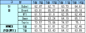 5월14일 0.88달러 상승 64.61달러 형성 … WTIㆍBrent는 보합세 5월14일 국제유가는 원유 수요증가 예상 및 나이지리아 정정불안 심화 등으로 상승했다.한국석유공사에 따르면, 뉴욕상업거래소(NYMEX)의 WTI(서부텍사스 중질유) 선물유가는 전일대비 배럴당 0.09달러 상승한 62.46달러에, ICE의 Brent 선물유가는 13일과 동일한 66.83달러에 거래를 마감했다. Dubai 현물가격은 나이지리아 정정불안 등의 영향으로 0.88달러 상승한 64.61달러를 형성했다.