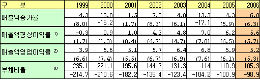 성장성과 재무구조는 개선됐다. 성장성 지표인 매출액증가율은 6.0%로 1.7%p 상승했다. 제조업은 조선ㆍ기타운송장비와 LCD 및 반도체 등 전기전자업종을 중심으로 매출액이 크게 상승했다. 투자동향을 반영하는 유형자산증가율도 0.6%p 상승한 5.2%로 2003년 이후 상승세를 지속했다. 하지만, 제조업은 0.2%p 하락한 6.0%를 나타내 설비투자 등 성장동력 확충이 미흡했던 것으로 조사됐다. 국내기업들의 부채비율은 2006년말 현재 105.3%로 2005년말에 비해 5.6%p 하락하는 등 재무구조도 개선추세가 지속되고 있다. 표, 그래프: | 국내기업의 경영분석 지표 변화 | <화학저널 2007/05/15> |