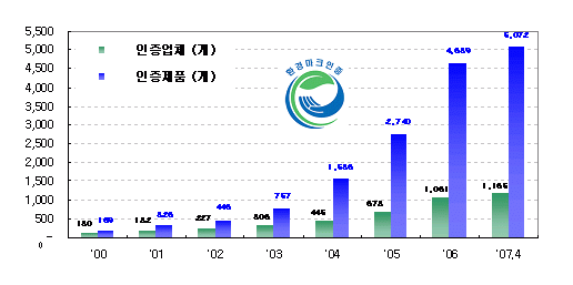한편, 환경마크는 1997년 GEN(Global Ecolabelling Network: 국제환경라벨링운영기구 협의체)에 가입한 이후 국제적으로도 활동범위를 넓혀 2002년부터 일본, 중국 등 6개국과 MRA(상호인정협정)를 체결하는 등 해외 환경마크 운영기관과의 상호교류도 활발히 하고 있다. 표, 그래프: | | <화학저널 2007/05/17> |