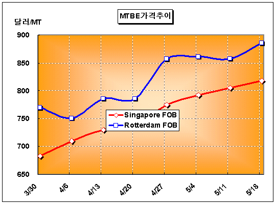 아시아 가격 톤당 12.5달러 올라 … 국제유가 오르며 동반상승 아시아의 MTBE(Methyl Tertiary Butyl Ether) 가격이 톤당 12.5달러 상승했다.국제 유가가 배럴당 2.31달러 오른 64.86달러에 거래되면서 MTBE 상승세가 더욱 고조돼 6월 판매가격이 톤당 835달러까지 상승하자 구매를 기피했던 수요기업들은 6월 선적분 2000톤에 대해 FOB Singapore 톤당 약 815달러에 거래를 마쳤다. 유럽의 MTBE 가격은 FOB Amsterdam/Rotterdam 기준 톤당 868달러에 거래를 마친 반면, 미국의 MTBE 가격은 FOB US Gulf 기준 톤당 약 845달러에 거래됐다.