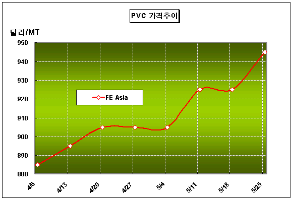 중국수요 증가 따라 상승세 지속 … 5월 셋째주 945달러로 상승 PVC(Polyvinyl Chloride) 가격이 5월 셋째주 CFR China 톤당 940-950달러로 20달러 상승했다.타이완과 일본산 PVC Spot 물량이 중국으로 4만톤 가량 유입되고 있지만 중국의 PVC 수요증가가 계속되고 있어 아시아의 PVC 가격이 하락할 기미를 보이지 않고 있다. 중국의 PVC 내수가격은 Ethylene 베이스가 톤당 7800-8000위안으로 300-600위안 상승했으며, Carbide 베이스는 톤당 7300-7400위안에서 7400-7600위안으로 200-300위안 상승했다. PVC 수요는 중국 뿐만 아니라 중동, 아프리카, 러시아 등 세계적으로 호조를 보이고 있다.