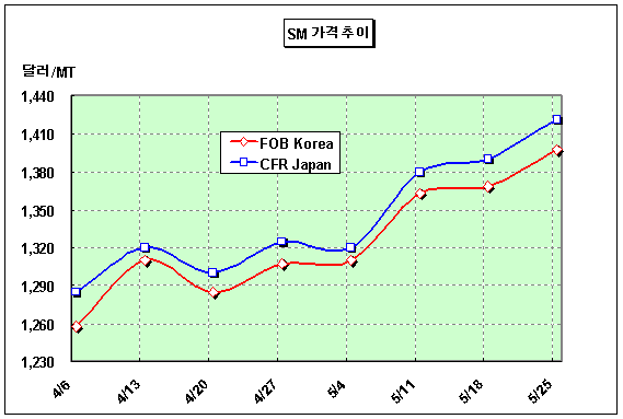 FOB Korea 1397-1398달러로 29달러 상승 … 미국가격 1425달러 SM 가격은 5월 넷째주 FOB Korea 톤당 1398달러로 29달러 급등했다.아시아 SM(Styrene Monomer) 시장은 미국 드라이빙 시즌의 영향으로 미국에 대한 벤젠(Benzene) 수출이 호조를 보이면서 1400달러에 근접했다. 특히, 중국에서는 6월 상순 거래가격이 90일 신용거래 기준으로 CFR China 1430달러까지 상승한 것으로 알려졌다. 중국의 SM 내수가격은 Zhangjiagang 기준 ex-Tanks 톤당 1만2800위안을 형성했다.
