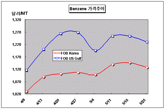 FOB Korea 1127-1128달러로 19달러 떨어져 … 미국은 24달러 하락 아시아 벤젠 가격은 5월 넷째주 FOB Korea 1127.5달러로 19달러 하락했다.아시아 벤젠(Benzene) 시장은 국제유가가 배럴당 65달러 안팎으로 초강세를 보이고 있음에도 불구하고 미국 수요가 감소세로 전환되면서 하락했다. 미국의 드라이빙 시즌을 맞아 아시아의 미국 수출이 활성화됐으나 6-7월 수입물량이 이미 도착해 더 이상 아시아산 수입이 필요없게 됐기 때문이다.