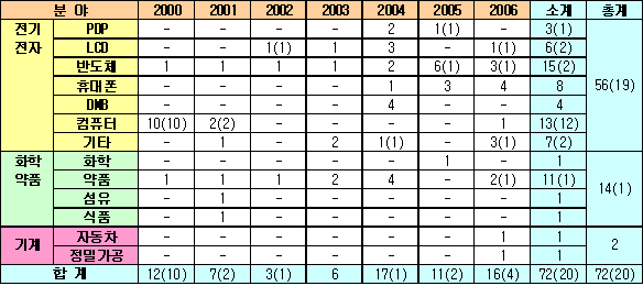 특허청은 첨단기술의 특허분쟁이 빈번하게 발생하고 있는 일본 현지에서 지재권보호 설명회를 개최함으로써 해외진출 국내기업의 지재권 분쟁 대응능력을 높임은 물론 현장의 목소리를 직접 들어 해외 지재권 보호 정책에 적극 반영할 계획이다. 표, 그래프: | 외국기업과의 특허소송 건수(2000-06년) | <화학저널 2007/05/30> |