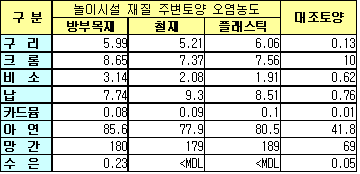 고농도의 중금속은 구토, 설사, 피부 및 호흡기 장애를 일으키는 등 인체에 심각한 영향을 초래할 수 있다. 표, 그래프: | 놀이시설 재질 주변토양의 유해물질 함량 | <화학저널 2007/06/1> |
