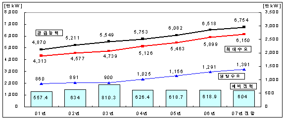 산자부, 7월 하순부터 8월 중순 … 자율절전 지원에 고효율기기 보급 2007년 여름철 전력 수요 최고점이 사상 처음으로 하루 6000만kW를 넘으나 예비전력이 충분해 수급에 큰 차질은 없을 것으로 예상된다.산업자원부는 6월11일 서울 삼성동 한국전력 본사 대회의실에서 김영주 산업자원부 장관 주재로 한국전력 등 11개 전력 유관기관 관계자들이 참석한 가운데 여름철 전력수급 대책회의를 열고 전력 수요 최고점과 전력 수급동향을 점검하고 수급 차질이 발생하지 않을 것으로 전망했다. 정부와 한전은 2007년 여름 최대 전력 수요점이 7월 19-26일, 8월 6-17일 사이에 나타날 것으로 보고 최고 수요기록이 2006년보다 4.3% 높아진 6150만kW에 달할 것으로 추정했다. 반면, 2006년 여름 이후 청송 양수발전 1호기, 2호기 등 194만kW의 시설용량을 갖춘 발전소들이 준공돼 최대 공급능력이 하루 6754만kW로 3.6% 늘어났다. 따라서 최대 수요지점에서의 예비전력은 604만KW로 수급에 큰 무리가 없는 것으로 판단했다.