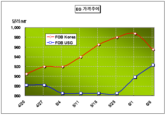 이에 따라 쿠웨이트의 MEGlobal이 최근 7월 아시아 계약가격을 CFR 톤당 1020달러로 결정해 6월8일 발표했으나 하락 정정이 불가피할 것으로 예상된다. 한편, 미국의 EG 가격은 Antifreeze 그레이드 기준 FOB US Gulf 파운드당 41.8-42.0센트로 톤당 평균 923달러로 25달러 상승했다. 표, 그래프: | EG가격추이 | <화학저널 2007/06/14> |