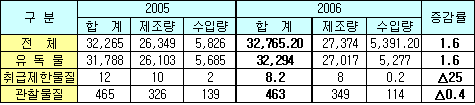 환경부, 2006년 3229만4000톤 유통 … 취급제한물질 25% 감소 2006년 국내에서 유독물, 취급제한물질, 관찰물질을 제조하거나 수입한 유통량이 2005년보다 1.6% 증가한 3276만5000톤인 것으로 조사됐다.환경부에 따르면, 2006년 유독물 등의 영업 및 수입실적 보고자 6997개 기업의 유독물 유통량은 3229만4000톤으로 1.6% 증가, 취급제한 물질은 8만2000톤으로 25% 감소, 관찰물질은 46만3000톤으로 0.4% 감소한 것으로 나타났다. 화학산업의 전반적인 침체로 유독물의 수요 증가가 미미했기 때문으로 취급제한물질의 급격한 감소는 몬트리올의정서의 오존층 파괴물질인 사염화탄소의 감축이 원인으로 작용한 것으로 해석된다.