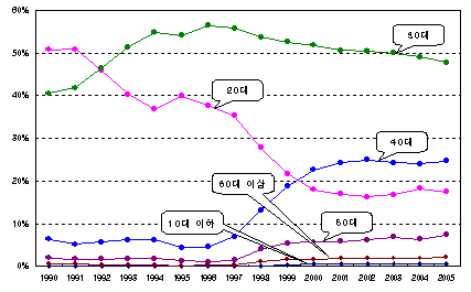 연구주체별로 20대 발명가의 출원은 기업이 1990년 50%에 육박했으나 2005년에는 20% 이하로 떨어졌다. 반면, 30대 발명가에 의한 발명 비율은 55.3%에 이르러 주류를 차지했고, 40-50대 발명가의 발명비율은 23%대에 머물러 다른 연구주체에 비해서는 다소 떨어지는 것으로 나타났다. 개인은 40대 발명이 주류를 이루고 있다. 20대 발명가의 감소현상은 1990년대 당시 20-30대에 해당했던 발명가의 발명활동이 이후 10여년 동안 지속적으로 이루어진 반면, 젊은 신규 연구인력 유입이 부족했기 때문으로 풀이된다. 특히, 전체 특허 출원의 76% 정도를 점유하고 있는 기업은 IMF 외환위기를 전후로 20대 발명가에 의한 발명이 급속히 줄어들고 있어 IMF 외환위기 이후 20대 신규 연구인력의 양성 및 발명 기여도가 저조한 것으로 분석됐다. IMF 여파로 20대 연구원 수가 급감했고, 대기업의 석ㆍ박사 등 고급인력 채용 확대경향 등으로 20대 연구 인력의 양성이 다소 저조했기 때문으로 분석된다. 표, 그래프: | 특허 출원된 발명의 연령별 점유율 변화 | <화학저널 2007/06/15> |