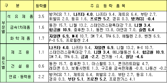 제조용은 원자재 가격상승 및 수요증가세 지속 등으로 나프타, 자일렌, 니켈 등이 올라 1.1% 상승했고, 연료ㆍ동력용은 국제유가 상승으로 방카C유, 제트유, 휘발유 등 대다수 석유제품이 올라 2.2% 급등했다. 표, 그래프: | 중간재 가공물가 상승률(2007.5) | <화학저널 2007/06/19> |