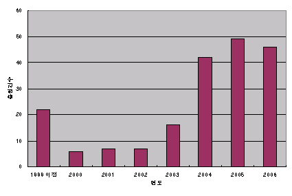 대표적으로 이산화티타늄(TiO2)을 사용한 광촉매층을 마감재에 형성해 벤젠(Benzene)ㆍ톨루엔ㆍ포름알데히드 등과 같은 휘발성 유기화합물을 분해하는 기술이 출원돼 관심을 끌고 있다. 다만, 개인의 출원이 법인 출원보다 2배 이상 많은 70%를 차지하고 있어 관련기업들이 보다 많은 관심을 가지고 기술개발을 할 필요성이 제기되고 있다. 우리나라 국민은 하루의 95%인 22시간 54분을 실내에서 보내는 것으로 조사돼 집을 예쁘게 꾸미는 일도 중요하지만 유해물질 없는 쾌적한 공간을 만드는 데 더 많은 관심을 가질 때이기 때문이다. 표, 그래프: | 새집증후군 관련특허 출원동향 | <화학저널 2007/06/19> |
