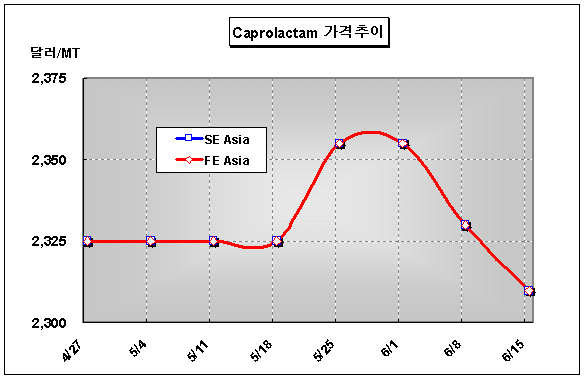 CFR FE Asia 2305-2315달러 형성 … 중국 구매감소에 원료가격 하락 아시아 카프로락탐(Caprolactam) 가격은 중국의 구매 물량 감소와 원료 가격하락으로 20달러 하락한 CFR FE Asia 톤당 2305-2315달러를 형성했다.원료 벤젠(Benzene) 가격은 5월18일 FOB Korea 톤당 1145달러로 상승세를 지속하다 5월23일 1126달러, 6월1일 1092달러, 6월15일 1042달러로 하락했다. 중국에서는 90일 신용거래 기준으로 카프로락탐이 전주대비 50달러 하락한 CFR China 톤당 2300-2320달러에 거래된 것으로 알려지고 있다.