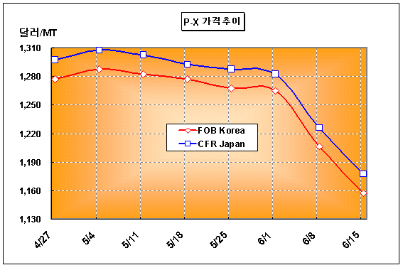 그러나 P-X Spot 가격이 급락하고 자일렌 가격도 FOB Korea 톤당 973달러로 무려 65달러 폭락해 인하 조정이 불가피한 상태이다. 표, 그래프: | P-X 가격추이 | <화학저널 2007/06/20> |