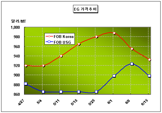 CFR Korea 930-935달러 형성 … Shell은 7월 990달러로 동결 MEG 가격은 6월 둘째주 CFR Korea 톤당 930-935달러로 22달러 하락했다.아시아 MEG(Monoethylene Glycol) 시장은 원료 에틸렌(Ethylene) 가격이 급락한 상태에서 Polyester 가동률까지 하락함으로써 2주 연속 떨어졌다. 중국의 Polyester 섬유 가동률 하락은 곧바로 MEG와 함께 PTA(Purified Terephthalic Acid) 가격 하락으로 이어져 MEG 가격의 추가하락도 예고되고 있다. 중국의 Zhejiang United Chemical Fiber는 6월15일부터 Polyester 섬유 가동률을 70% 수준으로 감축한 것으로 알려졌다. Zhejiang 지역의 Polyester 가동률은 이전까지 90% 수준을 유지했다.