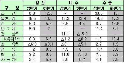 ++ 석유화학은 합성수지, 합섬원료, 합성고무 기준 +++ 섬유는 사류 기준| 고가 수주물량 출하가 본격화되고 있는 조선과 국내외 수요가 증가하고 있는 기계 업종은 생산과 수출, 내수 등이 모두 호조를 보일 것으로 예상된다. 전자는 수출호조가 이어지고 있는 가운데 경기회복 기대감에 따라 상반기에 부진했던 내수부문도 상반기보다는 호전될 가능성이 큰 것으로 예측된다. D램 가격 폭락으로 상반기 부진했던 반도체는 하반기 D램의 가격 반등과 생산조절 노력 등에 힘입어 생산과 수출이 회복세를 나타낼 전망이다. 건설은 분양가 상한제, 분양원가 공개 등 부동산 관련규제가 본격 시행될 예정이어서 민간건설 부문을 중심으로 부진이 불가피할 전망이다. 자동차는 내수가 2006년 수준을 유지하고 수출과 생산은 2006년의 부진에 따른 기술적 반등으로 다소 높은 증가율을 나타낼 전망이다. 표, 그래프: | 2007년 상반기 경기 및 하반기 전망 | <화학저널 2007/06/20> |