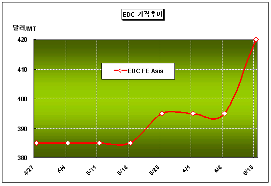 7월분 EDC 구매를 위해 협상을 진행중인 Tosoh는 CFR Japan 톤당 415달러에 구매 의사를 밝힌 반면, 판매가격은 425-430달러에 고정된 것으로 나타났다. Sulfindo는 7월분 EDC의 판매가격을 CFR SE Asia 톤당 425달러에 고시했다. <송주연 기자> 표, 그래프: | EDC가격추이 | <화학저널 2007/06/21> |
