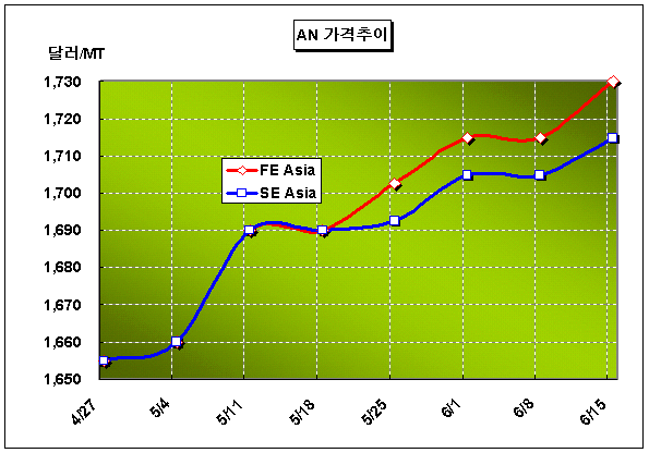 미국산 수입에 ABS 수요저조 불구 … 아크릴은 1700달러 이하 요구 AN 가격이 6월 둘째주 CFR FE Asia 톤당 1725-1735달러로 상승했다.아시아 AN(Acrylonitrile) 시장은 미국산 AN이 태평양을 건너고 있다는 소식이 전해지고 아시아 최대인 중국의 ABS(Acrylonitrile Butadiene Styrene) 수요가 침체되고 있으나 상승세를 지속했다. 인디아를 중심으로 한 서남아시아에서는 CFE S Asia 톤당 1820-1830달러로 초강세를 형성했다.