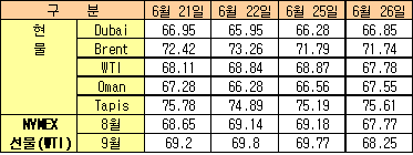 WTIㆍBrent유 1달러 이상 급락현상 … Dubai유는 66.85달러로 올라 6월26일 국제유가는 미국의 석유 재고가 증가할 것으로 전망되면서 하락했다.한국석유공사에 따르면, 뉴욕상업거래소(NYMEX)의 WTI(서부텍사스 중질유) 선물유가는 전일대비 배럴당 1.41달러 하락한 67.77달러에, 런던석유거래소(ICE)의 Brent 선물유가는 1.19달러 하락한 70.17달러에 거래를 마감했다. 반면, Dubai 현물가격은 미국의 정제 가동률 하락 우려가 뒤늦게 반영되면서 0.57달러 상승한 66.85달러를 형성했다.