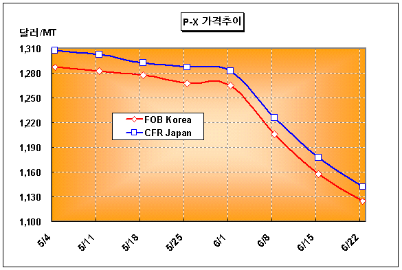 FOB Korea 1122달러로 33달러 떨어져 … PTA도 920달러로 약세 P-X 가격이 6월 셋째주 FOB Korea 톤당 1122달러로 33달러 하락했다.아시아 P-X(Para-Xylene) 시장은 중국의 Polyester 가동률 하락이 장기화되면서 공급이 넘쳐 1100달러 붕괴가 임박하고 있다. 이에 따라 P-X 공급기업들이 CFR China 1150-1170달러를 요구했으나 구매자들은 1100달러 수준을 제시하며 구매에 나서지 않고 있다.