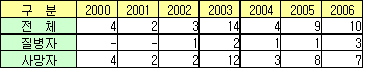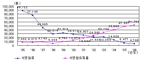 표, 그래프: | 석면 원료 및 석면 함유제품 수입동향 | 석면 원인 직업병 발생동향 | <화학저널 2007/06/28> |
