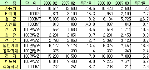 표, 그래프: | 주요 산업의 수입실적 및 전망 | <화학저널 2007/06/28> |