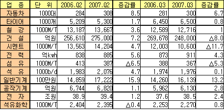 표, 그래프: | 주요 산업의 내수실적 및 전망 | <화학저널 2007/06/29> |