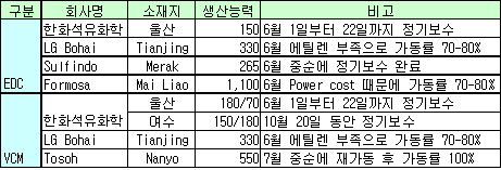 한화석유화학 정기보수 … LG Bohai는 에틸렌 공급부족 감산 아시아 EDC(Ethylene Dichloride) 및 VCM(Vinyl Chloride Monomer) 플랜트가 6월 들어 에틸렌(Ethylene) 부족과 정기보수 등의 이유로 가동률이 저조해 7월에는 수급이 타이트해질 것으로 예상된다.한화석유화학의 울산 소재 EDC 15만톤과 VCM 18만톤 및 7만톤 플랜트는 6월1일부터 22일까지 정기보수를 실시한 것으로 알려졌다. LG Bohai의 Tianjin 소재 EDCㆍVCM 33만톤 플랜트는 6월 들어 에틸렌 공급이 부족해 가동률이 70-80%로 떨어졌다. Formosa의 Mai Lial 소재 110만톤 플랜트는 6월 들어 Power Cost 때문에 가동률이 70-80%를 유지하고 있다.