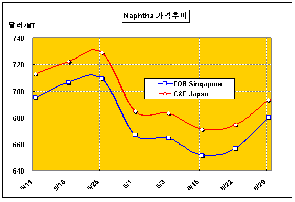 한편, 유럽의 나프타 가격은 CIF NWE 톤당 679달러로 0.5달러 상승에 그치면서 보합세를 나타냈다. 표, 그래프: | Naphtha 가격추이 | <화학저널 2007/07/02> |