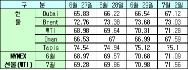 또 영국 런던의 통근열차 테러 2주기를 앞두고 영국 정부가 테러위험 단계를 최고수준으로 상향 조정하는 등 테러 우려감이 고조돼 상승세를 부추겼다. <김 은 기자> 표, 그래프: | 국제유가 변화 | <화학저널 2007/07/03> |