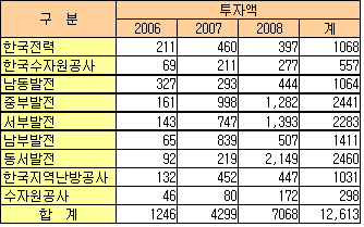 9개 공기업, 12조6130억원 투자 … 발전설비 384MWㆍ107Gcal/h 공급 9개 에너지 공기업은 2008년까지 신ㆍ재생 에너지 공급에 12조원을 투자하기로 합의했다.산업자원부는 한국전력, 한국수자원공사, 한국지역난방공사 및 6개 발전회사 9개 에너지공기업은 2007년 4299억원, 2008년 7068억원을 신ㆍ재생 에너지 발전설비 및 R&D 등에 투자할 계획이라고 밝혔다. 공기업들은 2006년에 신ㆍ재생 에너지 개발공급협약(RPA)에 따라 2006년에 1246억원을 투자한바 있다.