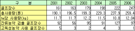 표, 그래프: | 일반 골프장 농약사용량 동향 | <화학저널 2007/07/05> |