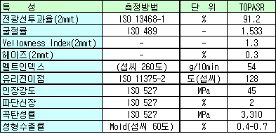 Polyplastics가 개발한 광학렌즈용 그레이드 <5013LS-01>은 종래 과제였던 고온고습 환경시험 후 광선투과율 저하를 대폭 개선했고 조성ㆍ배합 기술에 경주해 시험 후 헤이즈(Haze) 측정치가 △0.55로 91% 이상의 높은 전광선투과율을 실현했다. 또 유동성도 기존제품에 비해 200% 가까이 높아져 렌즈부품 소재 코스트다운에도 도움을 주고 있다. 이미 휴대전화 카메라렌즈용으로 국내외 렌즈 생산기업에 공급하고 있는데 촬영 렌즈와 함께 픽업 렌즈와 f-Theta 렌즈 등 레이저계 렌즈로도 확대해 5년 후에는 아시아 지역에 1500톤을 판매할 계획이다. TOPAS는 Daicel Chemical이 기본기술, Polyplastics이 응용개발과 아시아 판매, Polyplastics과 합작한 독일 TAP가 생산 및 생산기술 개발을 담당하고 있다. Polyplastics은 POM(Polyacetal) 등 결정성 수지에 주력하며 광학용도는 뒷전으로 미루었지만 최근 비정성 수지의 TOPAS가 본격적으로 경쟁에 들어가며 성정시장인 광학 관련용도로 확대하고 있다. 표, 그래프: | 5013LS-01 Resin의 기본물성 | <화학저널 2007/07/05> |