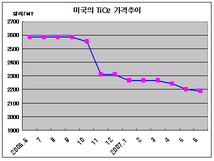 미국의 장식코팅 및 TiO2 생산기업들은 전통적으로 봄부터 여름 시즌에 수요가 절정에 달하는 점을 기대했으나 예상외로 부진해 TiO2 가격은 오히려 하락세를 보이고 있다. DuPont을 비롯한 TiO2 메이저들은 7월1일부로 북미지역의 TiO2 가격을 대폭 인상한다고 발표했으나 실제적으로는 인상하지 못하고 있는 것으로 알려졌다. DuPont은 7월1일부로 북미지역에 공급하는 TiO2 전체 그레이드의 가격을 파운드당 5센트(톤당 110달러), 중남미 공급가격은 톤당 100달러 인상한다고 6월4일 발표한 바 있다. Kronos와 Cristal은 6월8일, Tronox와 Huntsman은 6월11일 비슷한 수준의 가격인상을 발표했었다. 높은 수준의 고정코스트가 지속되고 일부지역에서 가격이 하락해 수익성이 악화되고 있다는 점을 이유로 제시했다. 표, 그래프: | TiO2 가격추이 | <화학저널 2007/07/05> |
