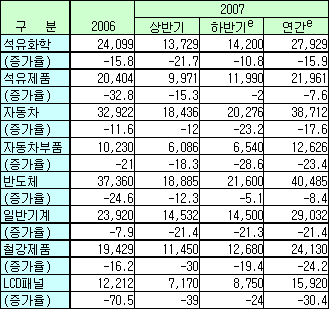 특히, 석유화학은 아시아, 중동지역의 신증설 설비 본격 가동에 따라 상반기 수출실적 증가율이 21.7%에서 하반기 10.8%로, 석유제품도 아시아, 중동지역의 설비 확대 등으로 가격이 안정세를 이어갈 것으로 예상됨에 따라 상반기 15.3%에서 2.0%로 둔화될 전망이다. 또 반도체는 PMP, 뮤직폰 등의 수요확대에 따른 내시플래시 시장확대에도 불구하고 D램 가격의 약세 지속으로 5.1%의 증가율에 머물 것으로 예상됐다. LCD 패널(24.0%)은 재고조정과 수요증가에 따라 완만한 상승세가 예상되며 자동차(23.2%), 조선(19.3%), 철강(19.4%), 일반기계(21.3%) 등은 호조를 보일 것으로 나타났다. 산자부 관계자는 “환율ㆍ고유가 등 대내외 여건에 대한 지속적인 모니터링을 강화할 것”이라며 “중소기업에 대한 환위험 관리, 신흥시장개척을 위한 집중적인 해외마케팅, 해외플랜트 수주 등 수출상품의 고부가가치화도 추진해나갈 계획임”을 밝혔다. 2007년 하반기 수출은 2006년 하반기에 비해 11.2% 증가한 1891억달러, 수입은 14% 증가한 1825억달러로 예상됐다. 표, 그래프: | 하반기 수출 전망 | <화학저널 2007/07/09> |
