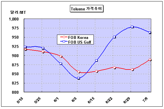 FOB Korea 889달러로 23달러 상승 … 미국은 963달러로 15달러 하락 톨루엔 가격은 7월 첫째주 FOB Korea 톤당 888-889달러로 23달러 상승했다.아시아 톨루엔(Toluene) 시장은 미국의 드라이빙 시즌을 맞아 국제유가가 크게 오름에 따라 아시아 시장에도 영향을 미쳐 900달러에 육박했다. 국제유가는 WTI(서부텍사스 중질유) 기준 8월 공급물량이 7월3일 배럴당 71.61달러로 강세를 나타냈다. BP는 8월 톨루엔 공급가격을 FOB Korea 톤당 889달러로 제시했으나 강세로 전환되자 910달러 수준으로 인상했다. 그러나 중국의 톨루엔 내수가격이 ex-Tank Zhangjiagang 톤당 6500-7700위안으로 보합세를 형성하고 있어 연속 강세를 보이기는 어려울 전망이다.