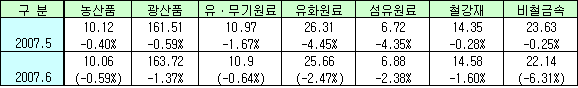 그러나 예상보다 작황이 좋은 옥수수(-4.17%)와 달러화 강세의 영향을 받은 금(-1.66%), 중국의 수요 위축이 예상되는 천연고무(-4.64%), 원피(-3.65%) 등은 약세를 나타냈다. 석유화학은 P-X(-11.63%)와 Naphtha(-4.36%) 가격은 하락하고 메탄올(Methanol)은 보합, Propane(5.71%)은 상승하는 등 등락이 엇갈렸다. 비철금속은 공급차질 우려가 이어진 납만 15.06% 상승했을 뿐 니켈(-19.89%), 알루미늄(-4.11%) 등은 일제히 하락했다. 표, 그래프: | 원자재 수입가격 지수 및 등락률 | <화학저널 2007/07/11> |