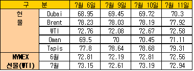 7월11일 0.58달러 상승 70.30달러 형성 … WTI 하락에 Brent 상승 7월11일 국제유가는 미국 휘발유 재고가 예상보다 큰 폭으로 증가함에 따라 하락했다.한국석유공사에 따르면, 뉴욕상업거래소(NYMEX)의 WTI(서부텍사스 중질유) 선물유가는 전일대비 배럴당 0.25달러 하락한 72.56달러에, 런던석유거래소(ICE)의 Brent 선물유가는 전일대비 0.96달러 상승한 75.44달러에 거래를 마감했다. Dubai 현물가격은 전일대비 0.58달러 상승한 70.30달러를 형성했다.