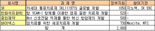 산자부, 바이오스타 프로젝트 4개 과제 지원 … 합성ㆍ바이오 분야 산업자원부가 바이오신약 생산 및 산업화 촉진을 위해 4개 신규과제를 선정하고 2007년에 28억원을 지원해줄 방침이다.산업자원부의 R&D 지원사업인 <2007년 바이오스타 프로젝트>에 따르면, 바이오스타 프로젝트 사업에 신청한 28개 기업 31개 과제 중 <SK의 차세대 통증치료제> 등 4개 과제를 선정해 28억원을 우선 지원하고 계속과제에 대한 중간평가 결과에 따라 계속 지원할 계획이다. 지원대상 사업은 SK의 차세대 통증치료제, 한화석유화학의 <항 VCAM-1 항체를 이용한 염증질환 치료제>, 중외제약의 <Wnt신호전달 억제를 통한 혁신 항암제 개발>, 바이넥스의 <암치료를 위한 세포치료제 개발> 등이다.