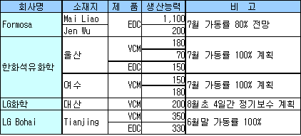 한편, LG화학은 8월초 4일 가량 정기보수를 실시할 것으로 알려졌다. <송주연 기자> 표, 그래프: | 주요 EDCㆍVCM 플랜트의 가동현황(2007) | <화학저널 2007/07/19> |