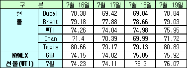 7월19일 1.80달러 상승 70.84달러 형성 … WTIㆍBrent도 크게 상승 7월19일 국제유가는 앙골라의 생산차질 및 중국의 빠른 경제성장 소식 등에 따라 상승했다.한국석유공사에 따르면, 뉴욕상업거래소(NYMEX)의 WTI(서부텍사스 중질유) 선물유가는 전일대비 배럴당 0.87달러 상승한 75.92달러에, 런던석유거래소(ICE)의 Brent 선물유가는 0.91달러 상승한 77.67달러에 거래를 마감했다. Dubai 현물가격은 전일대비 1.80달러 상승한 70.84달러를 형성했다.
