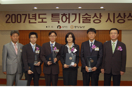 특허청, 2/4분기 특허기술상 개최 … 충무공상은 삼성SDI 연구원 차지 <염기변이 분석방법>으로 진매트릭스 김수옥 발명자 외 10명이 특허기술상 1위를 차지했다.특허청과 중앙일보는 공동으로 7월20일 한국지식재산센터에서 <2007년 2/4분기 특허기술상 시상식>을 개최했다. 특허기술상 특허부문 영예의 세종대왕상(1위)은 <염기변이 분석방법>을 발명한 진매트릭스 김수옥 발명자 외 10명, 충무공상(2위)은 <외광 반사를 줄인 플라즈마 디스플레이 패널>을 발명한 삼성SDI 유성훈 발명자 외 1명, 지석영상(3위)은 <치과용 보철물 및 그 제조방법>을 발명한 권오달 발명자가 수상했으며, 디자인부문의 정약용상은 <스피커가 부착된 휴대용 엠피쓰리 플레이어>를 창작한 윤하진 창작자가 수상했다.