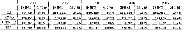 CJㆍ삼양ㆍ대한제당 15년간 부당차익 챙겨 … 자진신고 CJ 감면 CJ와 삼양, 대한제당 등 3사가 1991년부터 무려 15년간 출고물량과 가격을 담합해 막대한 차익을 부당하게 챙긴 사실이 적발됐다.특히, CJ는 2006년 밀가루와 세제에 이어 설탕 담합까지 적발돼 3개 생필품 담합에 모두 가담한 것으로 나타났으나 자진신고자 감면제도 등을 통해 고발은 모두 면제돼 논란이 되고 있다. 공정거래위원회는 7월22일 CJ와 삼양, 대한제당 등 국내 3개 설탕기업들이 1991년부터 2005년 9월까지 제품 출고량과 가격을 담합한 행위를 적발해 위반행위 금지명령과 함께 총 511억3300만원의 과징금을 부과하고 삼양, 대한제당 등 2사를 검찰에 고발할 방침이다. 과징금액은 CJ가 227억6300만원, 삼양은 180억200만원, 대한제당은 103억6800만원이다. CJ는 조사과정에서 담합사실을 자진 신고해 고발을 면했으며 과징금도 50% 감면 받은 것으로 나타났다. 삼양과 대한제당도 자진신고 했지만 1순위(100%)와 2순위(50%) 자진신고자만 제재를 감면해주는 규정에 따라 감면을 받지 못했다. 3사의 관련제품 매출액은 2001년부터 2005년까지 5년간 2조6000억원 정도로 매출액의 15-20%를 소비자 피해액으로 보는 경제협력개발기구(OECD) 기준을 적용하면 소비자들에게 수천억원에서 많게는 1조원 이상의 피해를 입힌 것으로 추정되고 있다. 또 3사는 1990년 말 각 기업 영업본부장들이 참석한 회의에서 1992년 원당 수입자유화를 앞두고 경쟁이 치열해지는 것을 막기 위해 CJ 48.1%, 삼양 32.4%, 대한제당 19.5% 등으로 내수시장의 물량반출 규모를 정한 뒤 매년 초 또는 매월 각사 임직원들이 참석하는 회의를 열어 수요에 따라 조정해왔던 것으로 나타났다.