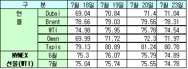 7월23일 국제유가는 OPEC의 유가관련 발언과 미국 정유가동률 증가 예상으로 하락했다.