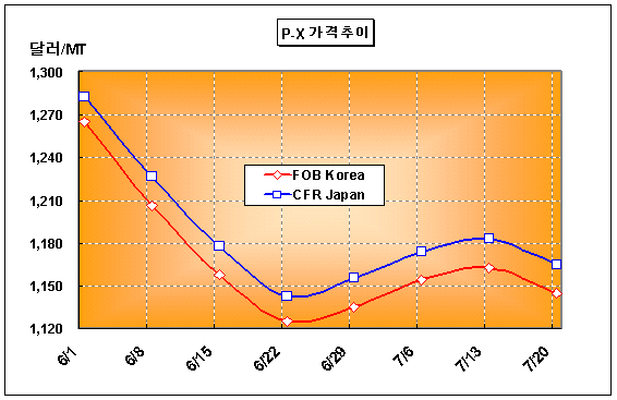FOB Korea 1145달러로 18달러 하락 … 중국 Polyester 시장 침체현상 P-X 가격은 7월 셋째주 FOB Korea 톤당 1145달러로 18달러 떨어졌다.아시아 P-X(Para-Xylene) 시장은 중국의 Polyester 가동률이 다시 하락세로 접어들 가능성이 나타남에 따라 1145달러 하락해 등락을 거듭하고 있다. PTA(Purified Terephthalic Acid) 가격이 CFR Asia 932-933달러 수준으로 하락했기 때문으로, 아시아 P-X 시장 전체가 침체되는 분위기가 감지되고 있다.