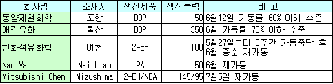 한화 2-EH 및 Nan Ya PA 6월 재가동 … Mitsubishi NBA는 7월 아시아 O-X(Ortho-Xylene) 시장은 다운스트림인 PA(Phthalic) 및 DOP(Dioctyl Phthalate) 수요부진 장기화로 지속적으로 가격이 하락했지만 7월 들어 PA 및 DOP 수요가 회복돼 가격이 소폭 상승했다.O-X 가격은 7월20일 FOB Korea 톤당 1060-1070달러 수준으로 1055달러에서 5달러 상승했다. 동양제철화학과 애경유화는 수요부진으로 각각 포항과 울산 소재 DOP 5만톤과 35만톤 플랜트의 가동률을 6월 60% 이하 수준으로 유지한 바 있다. 하지만, 7월 들어 시장 상황이 개선돼 한화석유화학은 여천 소재 2-EH(Ethyhexanol) 10만톤 플랜트를 5월27일부터 3주간 가동을 중단했지만 6월 중순 가동을 재개했다.