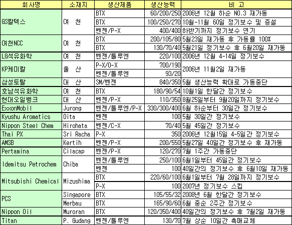GS칼텍스ㆍ호남 10월 정기보수 … 아시아 플랜트는 7월까지 마무리 아시아 BTX 시장의 정기보수가 7월까지 마무리되는 반면 국내에서는 10월까지 집중될 전망이다.GS칼텍스는 여천 소재 벤젠(Benzene) 10만톤, 톨루엔(Toluene) 25만톤, 자일렌(Xylene) 27만톤 플랜트를 10월부터 11월 사이 60일 동안 정기보수 및 Debottlenecking을 실시할 예정이며 벤젠 40만톤 및 P-X(Para- Xylene) 40만톤 플랜트는 하반기까지 연기한 것으로 알려졌다. 호남석유화학은 여천 소재 벤젠 18만톤, 톨루엔 9만톤, 자일렌 5만4000만톤 플랜트를 10월1일부터 한달간 정기보수를 계획하고 있으며, 현대오일뱅크도 8월25일부터 9월20일까지 계획하고 있다.