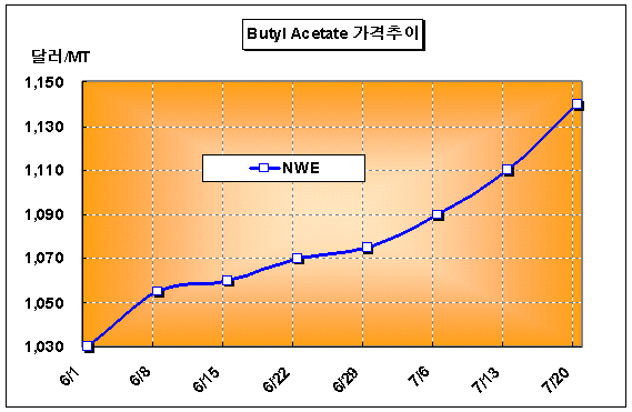 FD NWE 기준 1130-1150유로 … 당분간 가격하락 기대하기 어려워 7월 셋째주 유럽의 BA(Butyl Acetate) 시장은 꾸준한 수요에 비해 공급이 타이트해 가격 강세를 지속하고 있다.특히, BA 생산기업들이 3/4분기 초산(Acetic Acid) 공급 부족으로 인한 원료가격 인상분을 반영해 가격강세가 지속되고 있는 것으로 나타났다. 이에 따라 BA는 구매량이 적은 곳에는 Spot 가격보다 30-50유로 높은 톤당 1180유로에까지 거래되고 있는 것으로 알려졌다.
